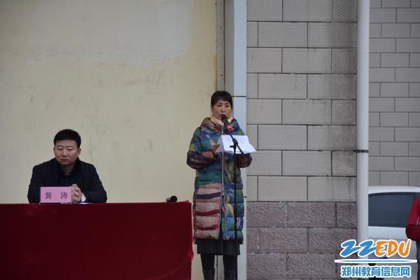 接下来,郑州42中党总支书记、校长于红莲致辞。她赞扬全体师生上学期的辛勤工作与努力付出,对上学期学校取得的各方面的荣誉进行总结,对新的一年提出新的目标和要求。她希望2019届的同学们可以在这个充满生机与活力的学期中为自己的初中生活画上圆满的句号,取得辉煌的成绩,同时也希望全体师生可以团结一心,百尺竿头,更进一步。