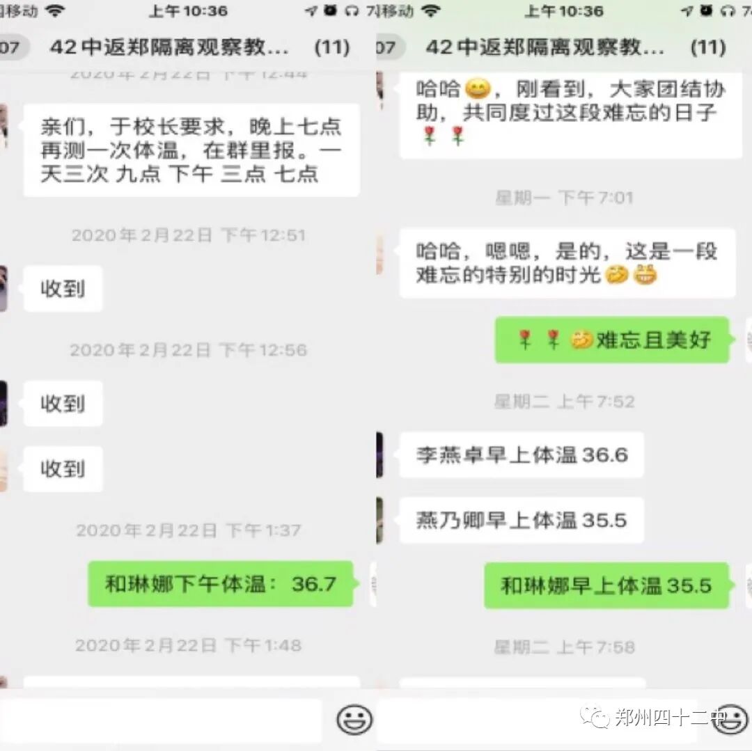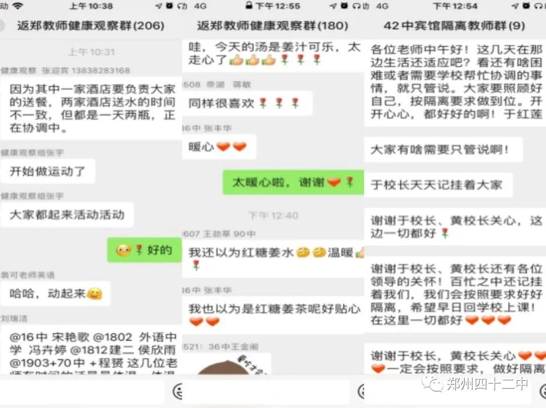 在这样的特殊时刻,青年教师无时无刻都能感受到来自学校的关心和爱护。中原区教体局要求每天上报两次体温,于红莲校长要求隔离教师早中晚一日三次体温上报,王松艳主任每天询问我们的体温状况,关心我们的健康,并且竭力帮助我们解决日常所需。