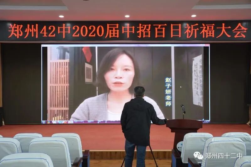 庚子春上,万物萌发。一场突如其来的新冠肺炎疫情,打乱了所有人的生活节奏,使学生不得不 “宅”在家中,网络学习。突如其来的疫情,虽然阻断了初三学子返校的脚步,但是,阻断不了追求梦想的决心,更动摇不了中招必胜的信念。2020年3月15日,在中考倒计时100天的日子里,郑州第四十二中学学校领导、全体初三师生和家长隆重举行了2020届九年级百日祈福大会。这是一场特殊的“百日祈福大会”,会议在六楼礼堂举行,全体初三师生、家长通过线上参与,九一班班主任陈利春主持大会。