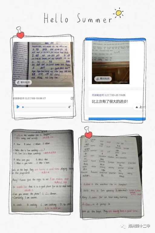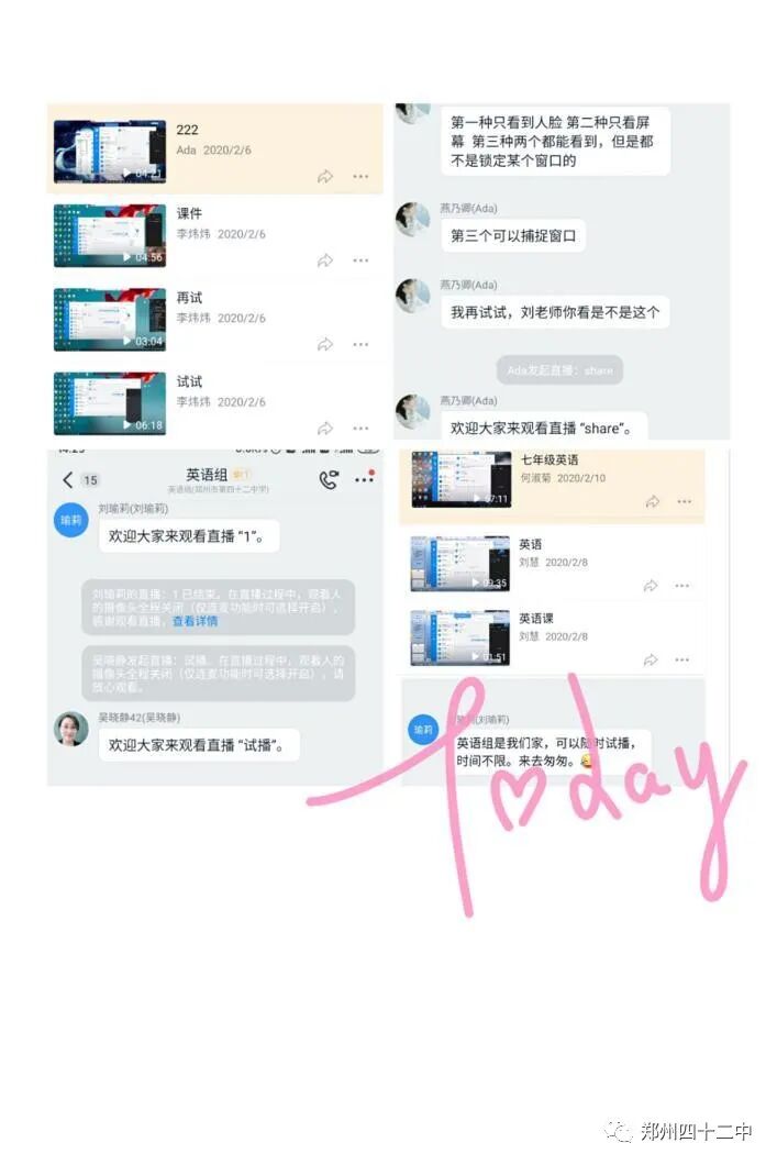 一、 初“线上”准备pring comes 在这个信息时代,七年级英语备课组的教师,一直保持着持续学习的精神。对于之前从没听过的“钉钉”,备课组长吴晓静老师,第一时间试课,分享自己的直播感受。刘瑜莉、何淑菊老师信心满满,下了一番大功夫,如今也是可以随时随地打开电脑,开启一场线上直播。李炜炜、刘慧老师,更是反复试播,只为呈现更加优质的课堂。燕乃卿老师在掌握了三种直播模式切换后,变身“主播”,教给各位老师。 她们对新领域充满了未知与探索,唯恐因为自己的不熟练操作,耽误孩子们的学习。刘瑜莉老师笑谈到,“英语组是我们的家,可以随时试播,时间不限。来去匆匆。” 二、常“云上”相遇ng comes 周一到周五,每天提前5分钟候课,相遇电脑钉钉,课本、教案本和学生作业情况记录本放在手边,是英语组雷打不动的好习惯。 几周教学之后,对于线上教学情况,七年级英语组开启了以往的知心话讨论和总结。燕乃卿老师说,一道题可以多人进行回答;英语视频资源可以直接在线播放,不用想办法下载;授课的容量也大了一些。 刘慧老师提到,钉钉家校本直接统计出完成作业的情况,对于未完成的可以一键提醒;语音评价也是一个很好的功能,对于学生们作业完成的不同情况,能够进行个性化、“一对一”的语音辅导。上课时遇到的连麦提问问题,李炜炜老师还建议,开发一种比连麦快的功能;吴晓静老师也说,希望老师能有连麦主动权,不是被动的等。 每次视频会议,每次总结,都会有火花的碰撞与不同的收获。在知心话讨论和总结中,英语组家庭的老师们,又get到了新的技能。 三、盼山花烂漫 三月已至,春色明艳,海棠花开。随着线上学习的持续进行,七年级英语组也不断更新着教学设计。 从最开始的未知新奇,学生们渐渐习惯了线上的学习方式,心理上慢慢出现了一些微妙的变化。对于听课和作业,多了一点点敷衍,少了一些认真。这些熟悉名字的作业上,出现了越来越多的圈圈点点,作业被打回的次数也变多了。手机屏幕后的老师们,眉头越发紧锁,心里越发焦灼。 何淑菊老师和李炜炜老师在群里讨论着,班里同学们上课出现的情况;单词学习不深入,吴晓静老师提到,可以通过造句增强掌握程度;学生们没有资料,刘瑜莉老师建议,可以找一些参考书,拍下来给孩子们当课后练习;燕乃卿和刘慧老师还补充道,通过一些英语微视频,一方面在课堂上活跃气氛,同时也帮助学生们拓展知识。知心话谈论和总结后,七年级英语备课组又制定了新的教学计划。 这些微调整果真“奏效”了!家校本里,学生们的字体越写越漂亮,红对勾越勾越多。焦灼的心,渐渐平复;屏幕背后的眉头,又舒展开来!盼着“花朵”们,绽放自己的美丽。老师们的快乐说起来也就是很简单。 风恬日暖溢春光,共盼疫情去。山花烂漫,遍地之时,七年级英语组,期待与大家在42中相见。