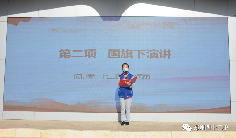 七二班学生代表赵思雨发表国旗下演讲。她引用习近平总书记的话,告诉同学们:青春是用来奋斗的。只有进行了激情奋斗的青春,只有进行了顽强拼搏的青春,只有为人民作出了奉献的青春,才会留下充实、温暖、持久、无悔的青春回忆。她呼吁全体同学从现在起,做有理想有目标的新时代好少年!政教处主任总结本次演讲。他希望全体同学能够牢记“青春由磨砺而出彩,人生因奋斗而升华”;希望全体学生能借助此次期中考试,及时总结经验、发现问题、高效学习。