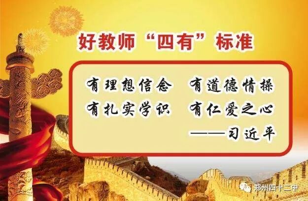 为深入学习贯彻习近平总书记重要指示精神,成为有理想信念、有道徳情操、有扎实学识、有仁爱之心的“四有”好老师,郑州42中持续开展“牢记育人使命,志做‘四有’教师”师德主题教育活动。