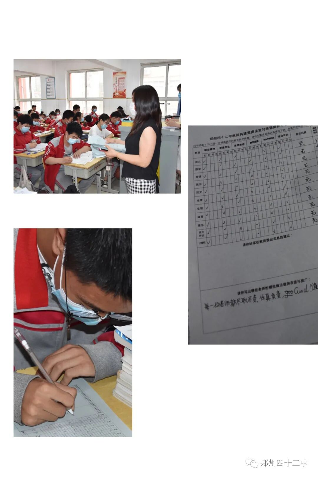 郑州42中把师德师风作为评价教师队伍素质的第一标准,6月4日下午,全校开展“评教评学”活动,每位学生认真客观评价每一位教师,学校教务处将对学生的评教结果进行统计,并向每位教师反馈,帮助教师増强教师教书育人的幸福感和使命感,帮助教师发现自身问题,不断凝聚师德正能量。