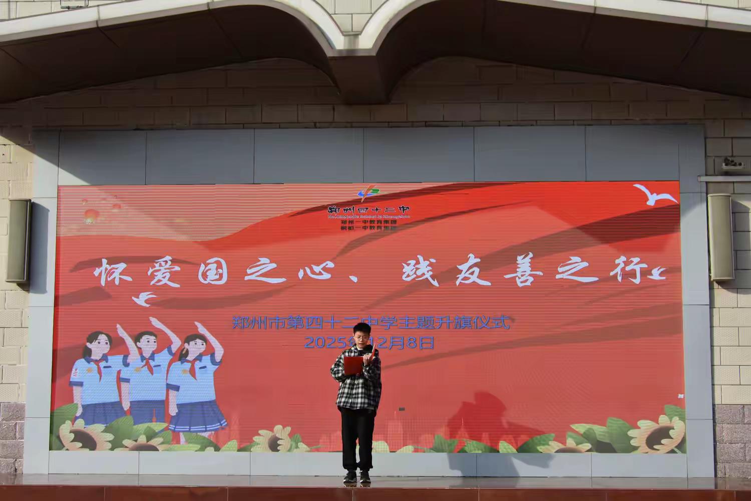 为深化学生的爱国主义情怀,营造文明和谐的校园氛围,12月8日上午,郑州市第四十二中学全体师生齐聚操场,举行“怀爱国之心,践友善之行”主题升旗仪式。
