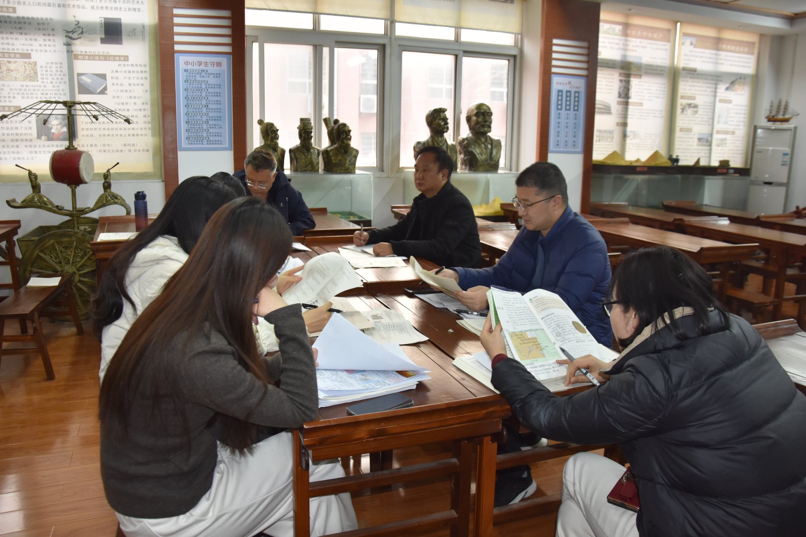 为提升青年教师们教育教学能力,促进青年教师不断进步与成长, 12月8日,郑州市第四十二中学文科青年教师“主体课堂”师徒汇报课活动在录播教室和历史功能室同时进行,副校长孙青山、黄涛和全体文科教师参加了此次活动。