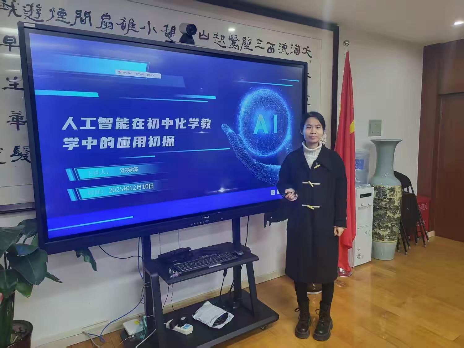 首先,邓婉婷老师以“人工智能在初中化学教学中的应用初探”为主题,分别从人工智能时代的教育变革、人工智能的基础认知、常见功能、在教育教学中的应用场景到人工智能在初中化学教学中的实施路径等五个方面进行了详细分享。随后,各参会教师各抒己见,并结合具体教学实践进行了深入的探讨与交流。
