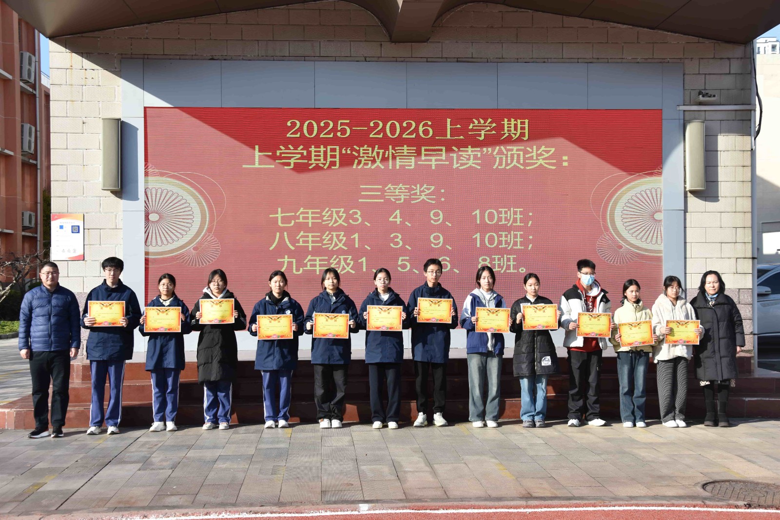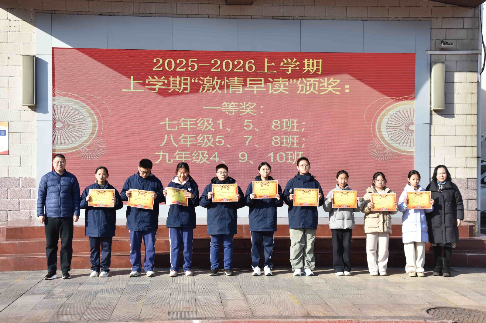 随后,学校党总支书记、校长于红莲,副校长孙青山为获奖班级颁发奖状并合影留念。