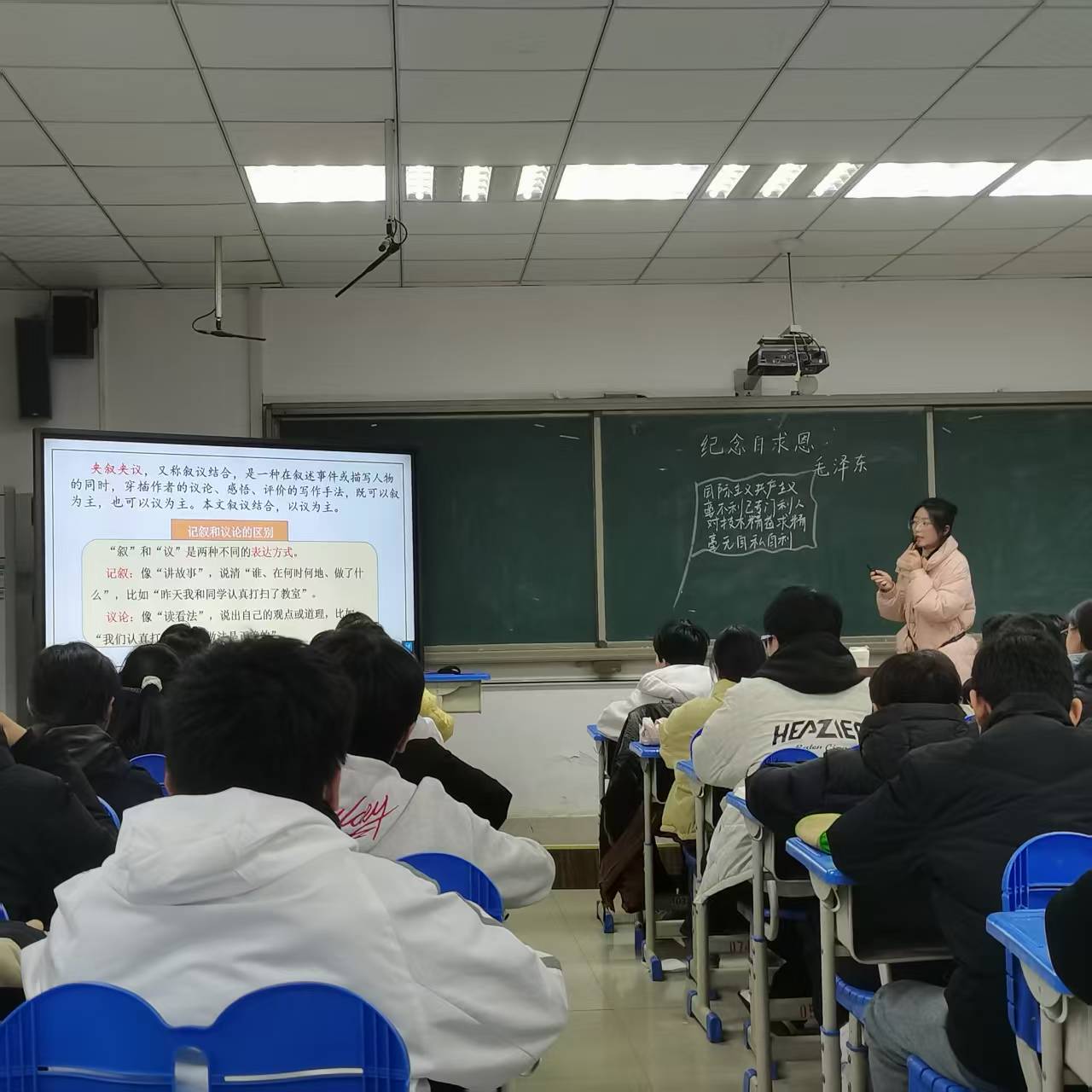此次活动分别由语文组梁梦晓、刘奕文、武梦梦,英语组高欣,政史地组赵晨廷五位教师授课。梁老师生动直观的视频引入,刘老师与学生的精彩互动,武老师优美的语言,高欣老师纯正的英语口语,赵老师对学生们爱国情怀的激发等,授课老师们以多元教学设计碰撞教学智慧,为广大师生们呈现了一场精彩纷呈的教学盛宴。
